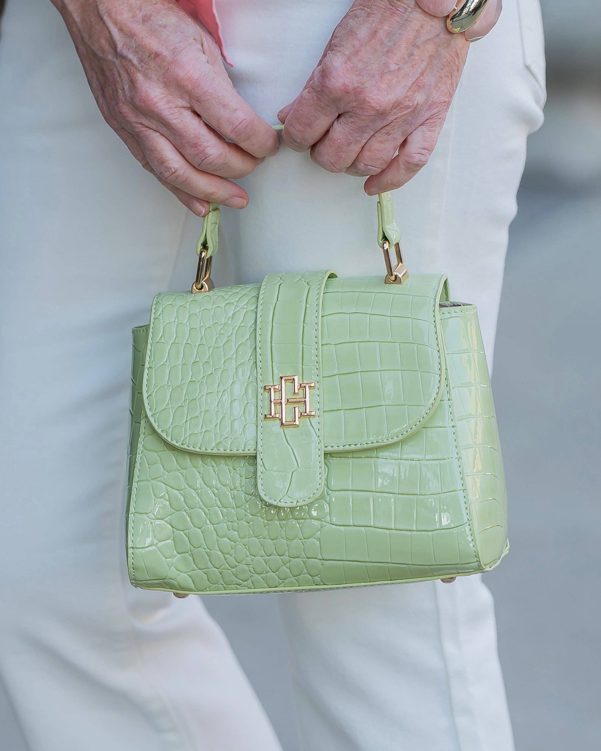 The Tucker Handbag in Lime Patent embossed croc combines chic sophistication with practical design. This stylish bag features a secure magnetic closure, elegant gold logo detailing, and a versatile top handle paired with a chain strap for multiple carrying options. Protective feet on the base keep your bag pristine. Perfect for elevating any look with timeless appeal and functionality.